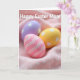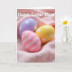 This card features a soft still-life scene with three decorated egg-shaped objects resting on blush-pink fabric, creating a gentle, affectionate mood like a quiet gift left for someone you care about 🌷. In the front, a pink egg stands out with neat white chevron-style stripes, its crisp pattern drawing the eye first. Slightly behind it, a lavender egg and a sunny yellow egg sit close together, their spacing and angle suggesting a tender togetherness 🐰. Both of the back eggs are dotted with small white star shapes, echoing tiny sparkles woven into the cloth beneath them. The lighting is diffused and airy, smoothing the pastel colors and giving the fabric a velvety look while the background stays softly out of focus. The words “Happy Easter Mom” appear as an overlay across the image in a light-colored font that contrasts gently against the pink background, placed so it doesn’t cover the main egg patterns. The pink fabric shows subtle shimmer-like flecks and folds that run diagonally under the eggs, with the front egg sharply defined and the two behind it softly blurred.