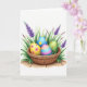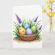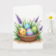 Designed with a rustic woven basket at the center, this card shows four decorated eggs nestled together like close friends sharing a quiet moment 🐰. The eggs feature a mix of bright greens, soft yellows, and rich purples, with patterns that feel carefully matched rather than competing. The basket rests on lightly textured wooden planks, adding a cozy, homey setting that suggests a relaxed spring morning. Around the basket, layered green leaves rise up and lean inward, almost like a gentle embrace around the eggs 🌷. Slender purple flower spikes and a few reddish-brown sprigs add height and contrast, giving the scene a natural, garden-fresh look. A short Easter greeting sits near the top in soft green lettering, leaving plenty of white space so the illustration stays the focus. One green egg draws the eye with tiny yellow flowers and small butterfly details, set against the bright white background. The basket’s woven strands are shaded in warm tan tones, with subtle highlights that make the fibers look touchable.