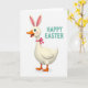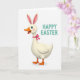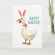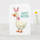This card features a cream-colored waterfowl centered on a bright white background, shown in profile with its head turned slightly as if sharing a friendly glance. Its large blue eyes feel inviting, and tall bunny ears with pink inner lining sit on top for a sweet Easter touch 🐰. A fuchsia bow is tied neatly around its neck, adding a gentle, dressed-up look like it’s ready to meet someone special. The orange beak is open as if mid-greeting, with matching orange webbed feet planted below, and soft shading gives the body a smooth, plush-like texture. To the right of the character, rounded teal text reads “Happy Easter,” spaced to balance the empty white space and keep the scene airy 🌷. The colors stay warm and light—creams, oranges, and pinks—so the character feels like it’s leaning into a cheerful hello rather than posing stiffly. The bunny ears tilt slightly upward, and the teal lettering sits at mid-height on the right side of the card.