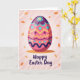 This design shows a tall, decorated egg shape centered on a softly rippling pink background, like a spring keepsake waiting to be found 🌷. Its glossy curve catches a pale highlight, giving it a polished look that draws you in like a quiet invitation. Near the top, a deep purple band holds a small teal flower, followed by teal wave patterns that feel like a gentle back-and-forth between close friends. Below that, a rosy section is dotted with small aqua circles, then a sunny yellow zigzag strip adds a lively rhythm across the middle 🐰. Deeper indigo waves settle toward the bottom, balancing the brighter colors and making the design feel warmly layered. Small ochre leaf shapes float around the background like confetti drifting between two people sharing a soft, knowing glance. Along the lower edge, a short greeting appears in a flowing dark ink, centered beneath the egg against the pink field. The egg’s pattern stacks from purple and teal at the top through pink, aqua dots, yellow zigzags, and indigo waves near the base.