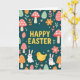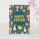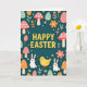 This design shows a deep teal background filled with springtime icons arranged like a cozy collage, with a friendly, romantic closeness in how the figures sit near one another. Near the top center, a festive greeting appears in large yellow sans-serif lettering, standing out clearly against the darker field. Below the words, two long-eared white rabbits with pink cheeks and rosy noses sit on either side of a small yellow chick, their gentle, angled poses suggesting they’re sharing the moment together 🐰. Around them, pastel egg shapes in mint green, coral, and orange are scattered like little finds, each decorated with simple dots and stripes. Spotted mushrooms in warm pinks and oranges tuck between the eggs, with small flowers and leafy sprigs filling the gaps 🌷. Subtle shadows beneath the shapes add a slight layered look, as if the pieces were placed on top of the background. The greeting text stays centered above the trio, while the rabbits and chick anchor the lower middle of the card amid dotted eggs, spotted mushrooms, and tiny blossoms.