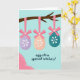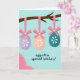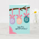 This design shows three decorated, egg-shaped ornaments hanging from a sturdy dark-brown tree branch, arranged evenly across the upper area like they’re keeping each other company. Each egg dangles from a slim pink ribbon with tiny dots, finished with a neat bow and a small white pearl-like bead that adds a sweet, gift-like touch. The background is a calm sky-blue, letting the soft spring colors stand out without feeling busy 🌷. One egg is lavender, one is apricot, and one is teal, each featuring a white six-petal flower centered on the front, as if the trio is dressed up for a friendly celebration 🐰. Around each flower, darker swirls in matching tones curl like gentle vines, giving the decorations a careful, affectionate look. In the lower right, the phrase “egg-stra special wishes!” appears in a casual, hand-drawn style in dark lettering. Along the lower left edge, a pink border with dashed stitching details frames the corner like a stitched ribbon trim. The bows sit just above each egg, with the dotted ribbons trailing upward to the branch.
