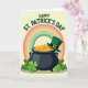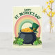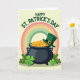 This greeting card shows a charcoal-black cauldron overflowing with golden coins, their little highlights catching the light like shared secrets between close friends. An emerald-green leprechaun hat rests on top at a slight tilt, with a gold buckle that draws your eye and adds a flirty wink to the scene 💚. Behind it, a soft rainbow arcs across the background in gentle bands of rose, lemon, mint, and sky blue, like a quiet promise hanging in the air 🌈. At the bottom, clusters of green shamrocks and leafy sprigs gather around the pot, as if leaning in together for a cozy moment. The background stays a warm, pale cream, letting the greens and golds stand out without shouting. Across the top, the words “HAPPY ST. PATRICK’S DAY” curve in dark green, centered above the illustration like a friendly banner. The coins spill forward in a loose cascade, with shamrocks framing the base and the pastel rainbow hovering behind the hat and cauldron.