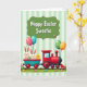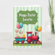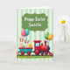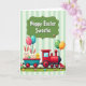 This greeting card features a soft background of vertical green-and-white stripes, setting a springtime scene that feels sweet and close. A bright red locomotive rolls across the front, pulling a blue wagon where two white long-eared bunnies 🐰 sit cheek-to-cheek with rosy faces and wide smiles, as if sharing a private joke. A small yellow bird rides alongside them with its beak open, adding a lively note to the cozy little group. Around the train float egg-shaped balloons in pink, teal, green, and orange, decorated with polka dots and stripes that echo the bunnies’ lighthearted energy 🐇. In the foreground, green grass is dotted with patterned eggs, arranged like little surprises waiting to be found. Near the top, a green sign with a thin gold border holds the greeting “Happy Easter Sweetie” in white letters, centered and easy to spot. The sign sits above the train while the colorful balloons and scattered eggs fill the lower half with pastel-and-primary contrasts. The red engine has rounded edges and small dark wheels, and the wagon is packed tightly with the two bunnies, the yellow bird, and a cluster of egg balloons.