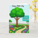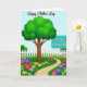 Designed with a sunny garden scene, the card features a broad, branching tree with dense emerald leaves and a sturdy brown trunk anchoring the lower area. A winding stone path of irregular warm-beige pavers starts near the lower right and leads the eye inward, like a gentle walk two friends might take side by side ❤️. Thick green grass surrounds the path, and clusters of stylized flowers in fuchsia, violet, scarlet, and yellow fill the foreground with a soft, affectionate energy 🌼. A crisp white picket fence runs across the middle, separating the flower beds from rounded green bushes under a clear blue sky. A small bright-blue bird with an orange beak perches on the fence, adding a light, companionable touch. The main message appears in flowing lettering near the upper portion, while a teal plaque-style shape nearby holds smaller words in white. The teal plaque sits toward the right side above the fence line, framed by blossoms and leafy greenery.