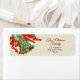 Botanical illustration of Christmas bell with red bow and mistletoe on antique beige paper background, custom family name and address, easily personalized.