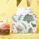 Decorative wrapping paper features an array of charming holiday illustrations, including trees, candles, ornaments, and candy canes, creating a joyful Christmas atmosphere perfect for presents.