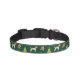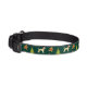 a Christmas-themed dog collar with a repeating pattern. The pattern consists of several elements, including whippets wearing red Santa hats and red scarves, green Christmas trees decorated with red ornaments, gingerbread men, and candy canes. The background color of the collar is dark green, which contrasts nicely with the colorful elements.