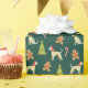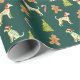 a Christmas-themed wrapping paper with a repeating pattern. The pattern consists of several elements, including whippets wearing red Santa hats and red scarves, green Christmas trees decorated with red ornaments, gingerbread men, and candy canes. The background color of the wrapping paper is dark green, which contrasts nicely with the colorful elements. The design is festive and whimsical, making it suitable for wrapping Christmas gifts, especially for dog lovers or those who appreciate a playful holiday theme.