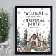 Welcome guests in festive style with this elegant Christmas party welcome sign, featuring a cozy watercolor winter cabin nestled in a snowy forest scene. The cabin, placed in the bottom right corner, is accented by pine trees, holly berries, a wreath on the door, and smoke gently rising from the chimney—bringing warmth and charm to your holiday celebration.