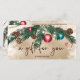Modern logo gift certificate with festive Christmas lights green pine branches snow with cute illustration of glitter Christmas ball ornament, green watercolor pine branches, mistletoe, pine cones, string fairy lights on luxurious gold metallic foil backgorund. Get ready for the shopping season and Christmas. Perfect gift for anyone! Add your logo.