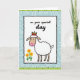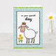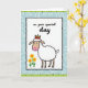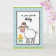 This card features a cute, stylized woolly animal centered inside a white rectangular panel, with a soft tan face, tiny dot eyes, and a gentle pink muzzle that gives it a sweet, friendly look ❤️. Resting on its head is a decorative crown-like accent in rich red, gold, and blue, adding a festive touch without overwhelming the simple character. The animal’s fluffy body is drawn with smooth, dark outlines, and its calm expression feels like a quiet nod of affection, like a friend showing up just to be there. Above the character, the phrase “on your special day” is placed near the top of the white panel in a flowing, dark-colored lettering. On the left side of the panel, three daisy-like flowers stand close together, with bright yellow petals, warm orange centers, and thin green stems that lean slightly as if reaching toward the animal 🌼. The main panel sits within a wide sky-blue border filled with white curving line patterns that loop and swirl like gentle breezes. Around that is a narrower lime-green band dotted with small, dark circular marks along the edge.