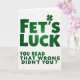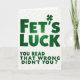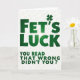 This card features the big headline “FET’S LUCK” across the center in deep emerald green, with thick, slightly worn lettering that looks softly shaded for depth. A four-leaf clover ☘️ replaces the apostrophe, adding a cheeky Irish touch and drawing your eye right to the middle. Behind the words, a pale green pattern of rounded shapes repeats across the background like faint shamrocks, giving the scene a gentle texture. The joke lands like a friendly nudge between close friends, as if the design is sharing a private grin with whoever’s holding it 💚. Below the main line, a smaller message reads “YOU READ THAT WRONG DIDN’T YOU?” in matching green, set under the headline and spaced to feel like a quick follow-up. The text sits centered and easy to spot, with even lighting that keeps the green tones crisp against the lighter backdrop. The overall layout stays simple and balanced, with the clover acting as the small focal point between the first word and the last. The pale patterned background remains subtle while the darker green lettering stands out sharply in the foreground.