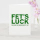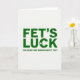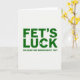 This greeting card features emerald-green lettering on a white background, with “FET’S LUCK” stacked in the center in distressed sans‑serif type 💚. A small three-leaf clover stands in for the apostrophe in “FET’S,” and another clover sits tucked inside the “C” of “LUCK,” adding a sly St. Patrick’s Day wink ☘️. The roomy layout leaves lots of white space, so the textured green print feels like it’s been pressed onto the surface. Below the main phrase, a smaller line of green text reads, “YOU READ THAT WRONG DID’N’T YOU?” and it’s centered under the big words. That little challenge creates a shared inside joke between sender and reader, like friends nudging each other with a grin across the room. The overall look stays simple and graphic, with the clovers acting like tiny cues that guide your eyes back through the phrase. A faint grid pattern lightly shows through the white background, giving the surface a subtle fabric-like texture behind the green type.