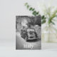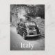 Photo postcard of a vintage old small FIAT 500 car in a street in a city in Italy in stylish black and white with the text 'Italy'.