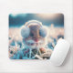 A small mouse with earmuffs stands amid frosty ground surrounded by a soft glowing light