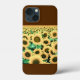 Phone case in a field of golden yellow sunflowers with chocolate brown centers and green leaves