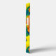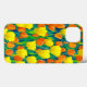 Phone case in a pattern of orange and yellow tulips and green leaves in a field, accented with a black background