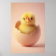 A fluffy yellow chick with an adorably fierce expression peeks out from a cracked eggshell against a soft pastel background. Perfect for Easter themes, baby products, or playful branding.