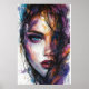 This striking wall art features a vivid watercolor portrait of a woman whose piercing blue eyes command attention. The piece blends bold brushstrokes with splashes of vibrant colors—deep purples, fiery oranges, cool blues, and warm golds—creating a dynamic sense of motion and emotion. Fine ink-like lines weave through her hair, adding depth and texture, while her crimson lips and intense gaze evoke mystery and strength. Perfect for modern interiors, art lovers, and anyone drawn to powerful, expressive portraiture, this artwork makes a dramatic focal point in any space.