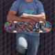 Dominate the streets with this electrifying skateboard deck design featuring a fierce neon tiger roaring through a surreal cosmic landscape. Exploding with vibrant graffiti-style elements, swirling abstract patterns, and dynamic flames, this deck is a masterpiece of rebellious street art. The bold colors and intricate details make it a perfect choice for skaters who want to stand out and ride with style.