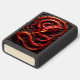 A magnificent red serpent dragon coils tightly into a circle, breathing a stream of intense golden fire. Its powerful form and razor scales are set against a dark, ornate background, wreathed in flame and glowing sparks, embodying untamed, primordial inferno power.