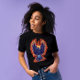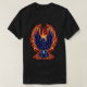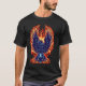 A powerful, black eagle soars through a fiery inferno, its wings outstretched and ablaze. The eagle's piercing eyes and sharp talons grip a human skull beneath it, symbolizing its dominance and control over mortality. The fiery background creates a dramatic and intense atmosphere, highlighting the eagle's strength and resilience.