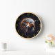An eagles majestic head surrounded by vibrant flames, set against a deep black background. The flames dance around the eagles fierce gaze, creating a striking and powerful image. With gold clock numbers