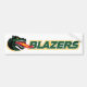This design features the head of a stylized dragon, the mascot for the University of Alabama at Birmingham (UAB) Blazers. The dragon's head is shown in a dynamic, left-facing pose, with its mouth wide open, emitting a stylized flame. The dragon is predominantly dark green, with black accents highlighting its features, and white, jagged teeth. Its eyes are a striking yellow, adding to its fierce expression. The flame emanating from its mouth is depicted with vibrant yellow, orange, and red hues, suggesting intense heat and energy.