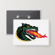 This design features the head of a stylized dragon, the mascot for the University of Alabama at Birmingham (UAB) Blazers. The dragon's head is shown in a dynamic, left-facing pose, with its mouth wide open, emitting a stylized flame. The dragon is predominantly dark green, with black accents highlighting its features, and white, jagged teeth. Its eyes are a striking yellow, adding to its fierce expression. The flame emanating from its mouth is depicted with vibrant yellow, orange, and red hues, suggesting intense heat and energy.