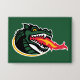 This design features the head of a stylized dragon, the mascot for the University of Alabama at Birmingham (UAB) Blazers. The dragon's head is shown in a dynamic, left-facing pose, with its mouth wide open, emitting a stylized flame. The dragon is predominantly dark green, with black accents highlighting its features, and white, jagged teeth. Its eyes are a striking yellow, adding to its fierce expression. The flame emanating from its mouth is depicted with vibrant yellow, orange, and red hues, suggesting intense heat and energy.
