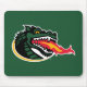 This design features the head of a stylized dragon, the mascot for the University of Alabama at Birmingham (UAB) Blazers. The dragon's head is shown in a dynamic, left-facing pose, with its mouth wide open, emitting a stylized flame. The dragon is predominantly dark green, with black accents highlighting its features, and white, jagged teeth. Its eyes are a striking yellow, adding to its fierce expression. The flame emanating from its mouth is depicted with vibrant yellow, orange, and red hues, suggesting intense heat and energy.