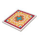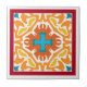 This beautiful tile features an exotic spanish tile design in a fiery orange kaleidoscope pattern with a blue accent in the center. It makes a great trivet for the pretty tea or coffee pot on the patio in the morning.