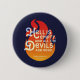 A bookish button featuring the quote from William Shakespeare’s The Tempest “Hell is empty, and all the devils are here” against an orange fire on a blue background.