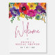 A colorful summer fiesta bridal shower welcome sign. This design features a large top boarder of vibrant watercolor flowers in purple, pink, yellow and orange, and "welcome" in dark pink modern handwritten style font. Personalize with your details.
