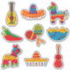This 9-sticker pack features Mexican stringed instruments, sombreros, pinatas, maracas, chile peppers, and totopos.