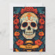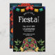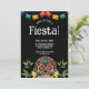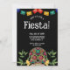 Festive holiday invitation for Fiesta! or any Mexican-themed event with gold border with a floral Mexican folk pattern on the front with a mustache .