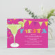 This fun and colorful fiesta invitation features a margarita glass and party decorations next to the word "fiesta" in coordinating colors. Text fields are fully customizable. Graphics ©Lilly Bimble.