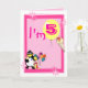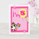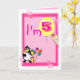 I'm five birthday card with funny clown, penguin and ice cream and balloons, on a pink background. Easily personalize this design by adding or changing the text.