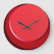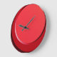 Retro modern red wall clock in a crescent moon shape with a iridescent red grid pattern on the inside.