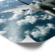 Great photo of a fighter jet in the sky. Great capture with beautiful clouds and islands visible on the ground.