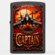 This highly dramatic metal lighter features a fighter jet dominating the frame, leading a squadron into a deep red and orange sunset. The sun casts a fiery glow over the low clouds and a distant body of water, creating an intense, air combat atmosphere. The striking scene is set within an elaborate, gilded red and bronze ornate border. The lighter is personalized with the name "Alexander" positioned above the massive, embossed title "CAPTAIN". This spectacular, personalized gift is perfect for a pilot, military officer, or anyone who commands a team on daring, high-stakes missions.