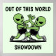 This poster features two aliens locked in a wrestling match, The aliens are mid-action, showcasing strength and agility as they grapple for victory. Above them text reads "Out of this World Showdown," emphasizing the thrilling battle taking place.