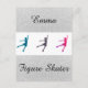 Girl's Figure Skater Postcard Personalized w/ Her Name. Silver faux glitter sparkle with 3 different colored figure skaters in the center on front and a light gray background on the backside with a tiny black figure skating silhouette in the bottom right corner.