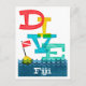 Colorful Fiji scuba design. Retro typography in inkpress style with the word "Dive", along with a scuba flag floating in the ocean.