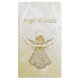 This is a holiday graphic design with the filigree Angel of Grace in hues of gold and white. She is holding a plaque with the word, "Grace". The angel is printed three times on the front and back over a golden-ombre background covered with snowflakes. The text printed on the top can optionally be changed or removed.