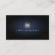 This simple yet very elegant business card features a simple gold icon of film editor film roll enclosed in a gold circle. Your name appears in matching colors and easy to read font below this icon. The background is jet black with a subtle blue glow in the center of the card, behind the name and icon, giving the card a striking look. Perfect for photography, film, video, artistic skills, filming skills, video skills, imaging, photo editing themes.