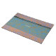 The modern graphic artwork by ZoeSPEAK on this Cloth Placemat was created from a scan of a strip of 35mm film. The background colors are muted sky blues and rusts. The film strip colors are muted aqua blues and golden browns. The top of the film strip, where it folds over, is black with aqua blue highlights. The line of white text, which reads "studio", is set to personalize, use as is, or delete if you prefer.