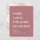 Finally a Party Simple Text Dusty Rose Pink Minimalist Save the Date. A modern simple design highlights this color editable typography! Finally. A party. With people. Save the Date! With a pretty marble texture on back side, but can be replaced by your own photo.