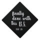 Cute and funny grad cap topper features the quote "Finally done with this B.S" (we mean Bachelor of Science! *wink wink*) in white brush script lettering on a black background. Personalize with your class year and/or school.